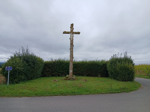 Ce calvaire, propriété communale, a été érigé le 26 mai 1912 au carrefour de la route de Brucourt et de la rue Poussée.